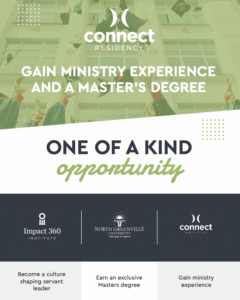 The Connect Residency is a partnership between North Greenville University, Impact 360 Institute, and Connect Ministries where YOU have the unique opportunity to serve alongside the Connect Ministries staff while gaining a Master of Arts in Leadership from North Greenville University.