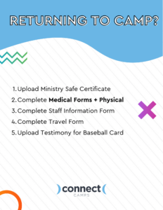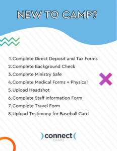 Each summer staffer is required to sign their contract, complete medical forms (including a physical), complete the Staff Information Form, and obtain an up-to-date Ministry Safe certification (these are valid for 2 years after initial completion). Check out these checklists below to ensure that you are up to date on all things paperwork!.